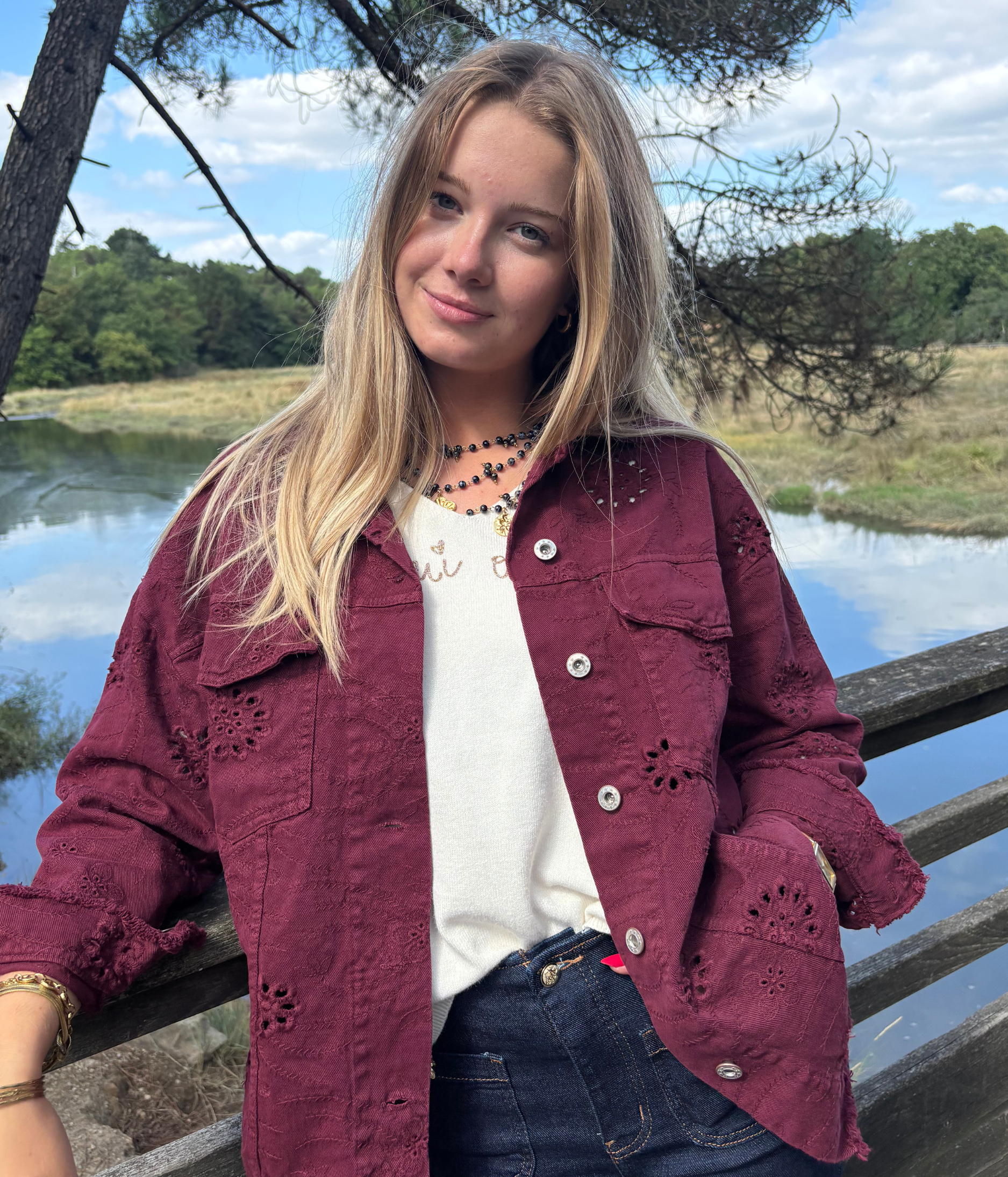 Cette veste est confectionnée en 100% coton, une matière douce, naturelle et agréable à porter. Sa coupe droite et légèrement oversize offre un tombé fluide et confortable. On craque pour ses broderies florales ajourées, ses poches plaquées sur la poitrine, ses bords effilochés et ses manches longues retroussables pour un effet décontracté.