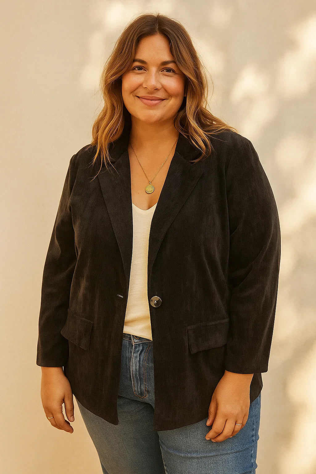 Cette veste en velours côtelé conjugue douceur et élégance pour sublimer toutes les silhouettes. Confectionnée dans une matière souple et légèrement stretch (95 % polyester, 5 % élasthanne), elle offre un tombé impeccable et une sensation de confort absolu. Sa coupe ample et fluide s’adapte parfaitement aux morphologies du 44 au 50, pour un style chic sans effort.