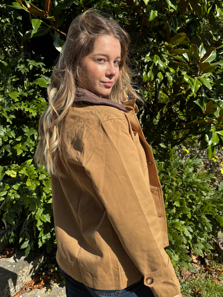 Cette veste en coton camel est une pièce incontournable du dressing automnal. Avec son col contrastant en velours marron, ses grandes poches plaquées et sa doublure à carreaux, elle allie style casual chic et praticité.