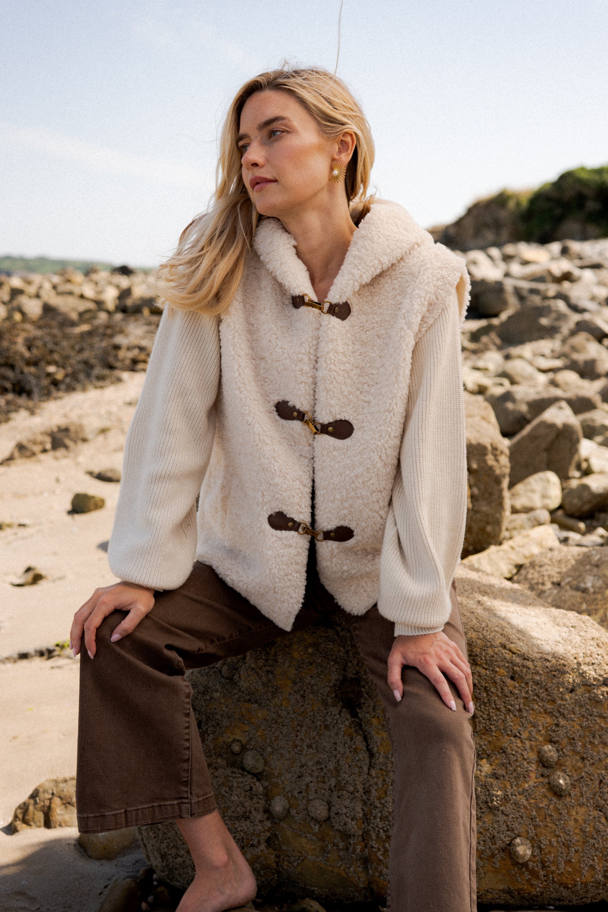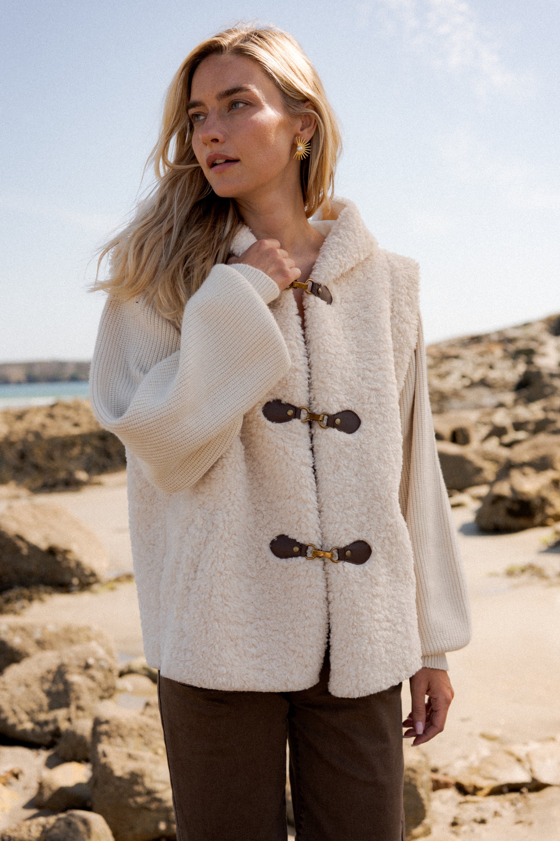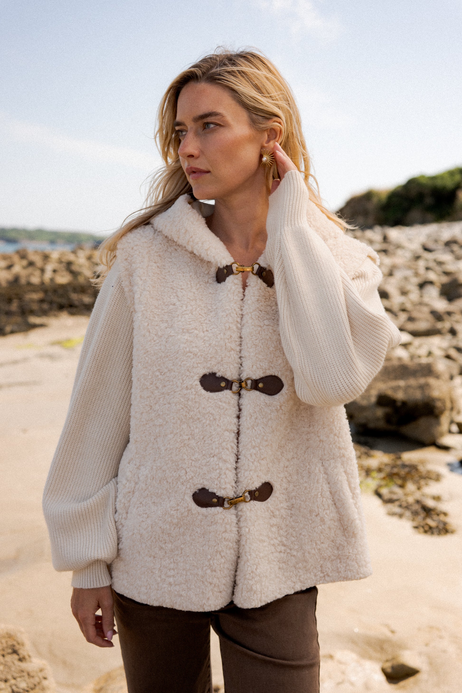 Craquez pour cette veste en fausse fourrure douce, parfaite pour conjuguer chaleur et tendance bohème chic. Conçue dans une matière contenant du polyester recyclé et de la laine, elle allie confort, douceur et démarche responsable. Sa capuche enveloppante et ses attaches brandebourg contrastées lui donnent un style authentique et unique.